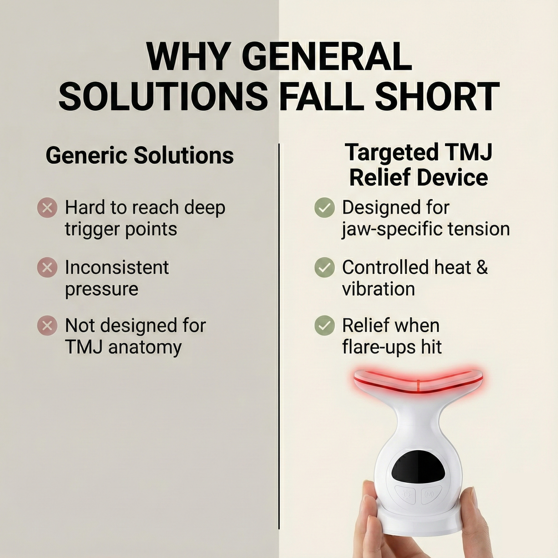 Traditional heat wraps and manual massage can feel good, but they are often bulky, inconsistent, and hard to use on specific jaw muscles. NeuroEase combines targeted heat and vibration in a compact device, allowing you to apply focused relief exactly where tension builds, without needing to lie down or use both hands.